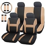 The covers themselves are great, they fit snugly onto my 2002 Camry and when taught almost look like pro upholstery in the front. The back is a different story. While in the front covers there is a opening left for the head rests to come through, there is no such opening in the back, also there is no opening for a third seat-belt in the middle of the back seat and no holes for the buckle receivers in the back either, I had to stretch the cover around the receivers and tuck them back. I decided not to cut holes in the back seat cover and leave the head rests off, It works for me but if you have frequent backseat passengers it may be something to consider. The steering cover also works well and the over all look of the covers is very nice, probably my favorite part about the whole experience. There are little tabs for the front seat that pull through the space between the back and bottom parts and go to the back seat as a way of keeping them from sliding and it works well. overall I am very happy with the buy, but if you frequently have people in the back seat or have a middle seat in the back you need to maintain use of, I would get another cover, or just lave the back part off and just use the bottom.