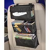 I purchased this as an organizer for my daughter to keep all of her books and small toy items that keep her entertained while in the car. I did not put a tissue box in as the picture suggests and items fell right through the slit because it hangs open. Items placed in the bottom pouch just flopped right out on the floor. It sticks out farther than I liked from the back of the seat and the material is flimsy much like the reusable "fabric" bags. I returned mine and found an $8 one in the car section of a major retailer that I am much happier with. It might work well for someone with a larger vehicle with more room and if used for actual media products.