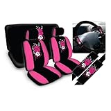 The steering wheel cover I received only has one set of flowers on it, not two, so not AS cute as the photo. I did not ask them to, but seller did not respond when i told them the wheel cover did not match the picture. (I myself have contacted buyers for my company who've had issues just as a courtesy, whether they expected a response or not). Description says product is a "standard fit" so I knew I was gambling. Front seats and headrests fit my 2002 Chrysler Town and Country great--description said no armrest holes/access; I cut my own. Back seat covers are too big for my van, and the top seat cover does not contain holes for the headrests. I am able to use the bottom seat cover and just tuck it in real well, but not the top. Still, material is good, and seems more durable than i expected. Love the amount of hooks to keep the covers attached, just sucks I had to get creative with where to put them, considering my van style. If you have plastic protective covers that go around the bottom and sides of your front seats, you will have to get even more creative. Took me an hour to fully install covers and wheel cover. Wheel cover looks very small but husband was able to get it on with some stretching and brute strength ;). Belt covers fit really well and are comfortable.